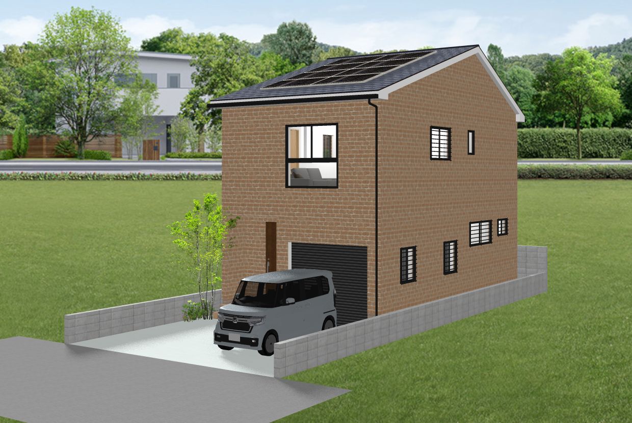 ビルドインガレージ付きのコンパクトな2階建てレンガ住宅です。お子さんが独立後のご夫婦や車が好きな独身者等にお勧めです。